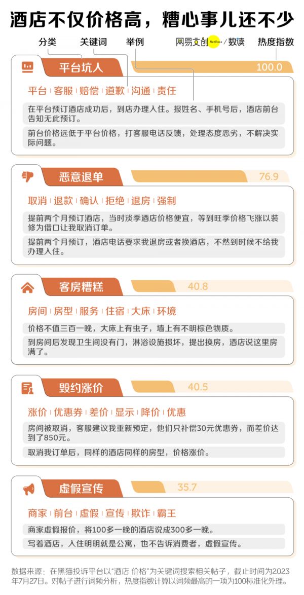 我们统计了黑猫投诉上今年 6 月 ~ 7 月有关消费者对酒店吐槽的帖子,发现在线平台体验差、恶意退单、客房糟糕,是被投诉最多的问题。