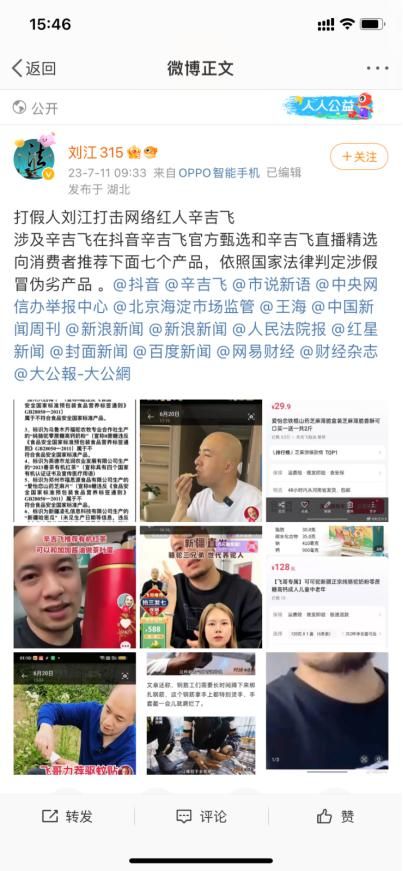 7月10日,微博账号“刘江315”发布一条“打假人刘江打假网络红人辛吉飞”的微博,直指辛吉飞带货涉假。