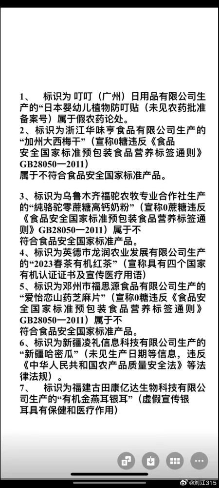 “在网络上以食品安全为主题演讲的短视频博主辛吉飞,在抖音上以辛吉飞官方甄选和辛吉飞直播精选;向消费者推荐的七个产品居然涉假,还有其他产品也涉假。目前正在检测中。”