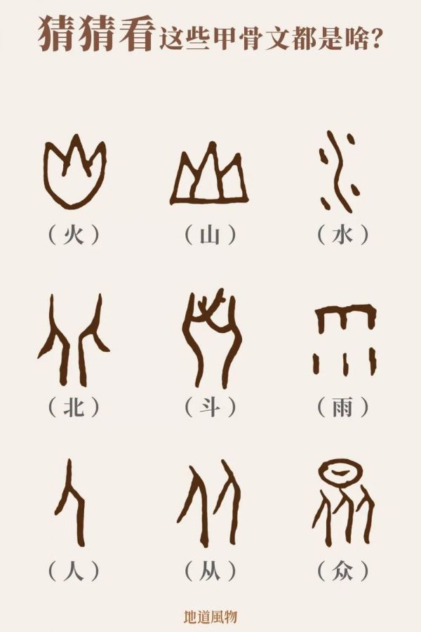火、山、水、雨这类简单的汉字,最早被辨认出来。这些文字,完全是自然现象的复刻,形象又粗糙,是殷商人的涂鸦山水画。
