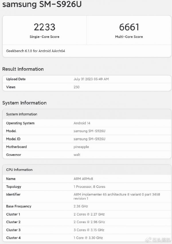 骁龙8 Gen3采用台积电4nm制程工艺,其中CPU为1+5+2八核架构,分别是1个X4超级大核+5个A720+2个A520小核,而CPU最高主频达到了3.3GHz。现在,骁龙8 Gen3首个CPU性能跑分现身了,机型为三星S24+,其CPU单核性能成绩2233,多核性能6661,。作为对比,骁龙8 Gen2单核2005、多核5274,苹果A16单核2510、多核6325。