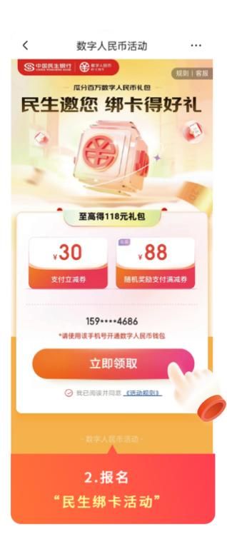 二、打开【数字人民币】App,开立数字钱包并绑定民生借记卡(如已开立,可直接绑定民生借记卡),即可获得30元京东数字人民币支付立减券。