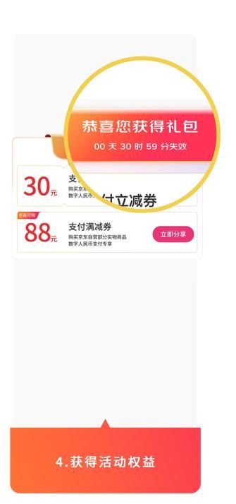 据了解,通过京东App报名活动的用户,首次将民生借记卡绑定到数字人民币钱包上,可获得30元京东数字人民币立减券一张(同一用户最多可以获得一张),同时,用户在活动页面进行分享,还有机会获得至高88元的数字人民币支付满减券。具体参与流程如下: