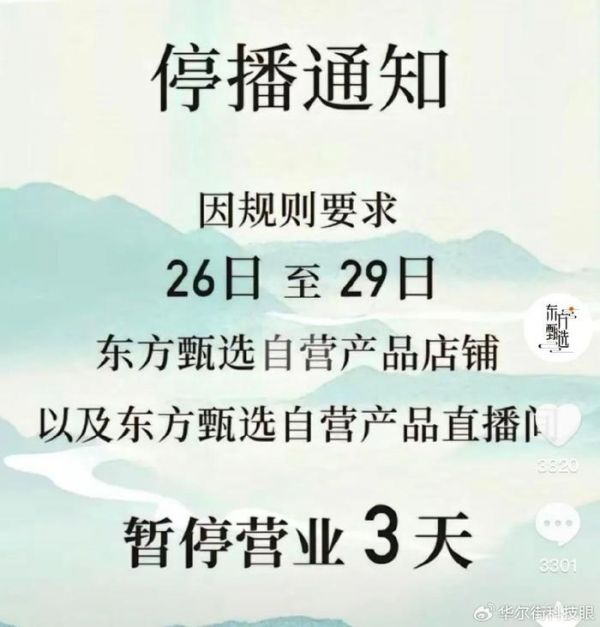 近日,“东方甄选自营产品”抖音直播间也发布了停播通知,称因规则要求,7月26日到29日,东方甄选自营产品店铺以及东方甄选自营产品直播间暂停营业3天。