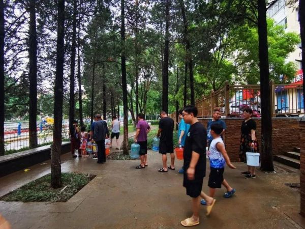 同样在范阳西路的一片绿化带,不少市民提着大大小小的桶和瓶子排队接水,这些水不能饮用,只能洗衣服、洗澡。饮用水只能买桶装水,冲厕所则用附近积水。日子虽然比平时不方便了很多,但大家都能理解。
