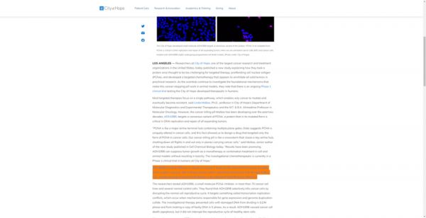 特别的是,希望城市(City of Hope)国家医疗中心官网写道:“AOH1996在治疗乳腺癌、前列腺癌、脑癌、卵巢癌、子宫颈癌、皮肤癌和肺癌的细胞的临床前研究中已取得成效。”“而且AOH1996可以口服,且代谢稳定,无论是作为单独治疗还是作为联合治疗,都可以抑制肿瘤生长,但不会引起可察觉的副作用。”(下图标识部分)