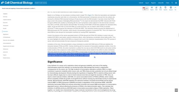 财联社记者随后前往希望城市(City of Hope)国家医疗中心官网和CELL官网核实发现,虽然相关期刊内容确实存在,但在疗效和意义的描述上,希望城市(City of Hope)国家医疗中心官网或存在一些过度解读。CELL官网期刊中的表述其实相对严谨和保守:“综上所述,我们的研究已经表征了这种现已进入1期临床试验的新药的独特分子机制,并且已经验证了该药物的独特作用机制,通过该机制抑制转录复制冲突的解决可能为选择性杀死癌细胞开辟了新的治疗途径。”