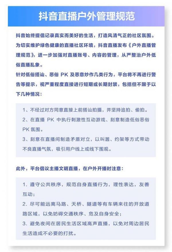 与此同时,抖音还发布了户外直播管理新规,称将加大对户外低俗直播的治理力度——不警告,直接封!