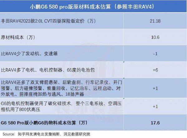 其以丰田RAV4荣放为参照,测算出定价20.99万的小鹏G6 580 Pro版本,原材料成本约为17.6万元。