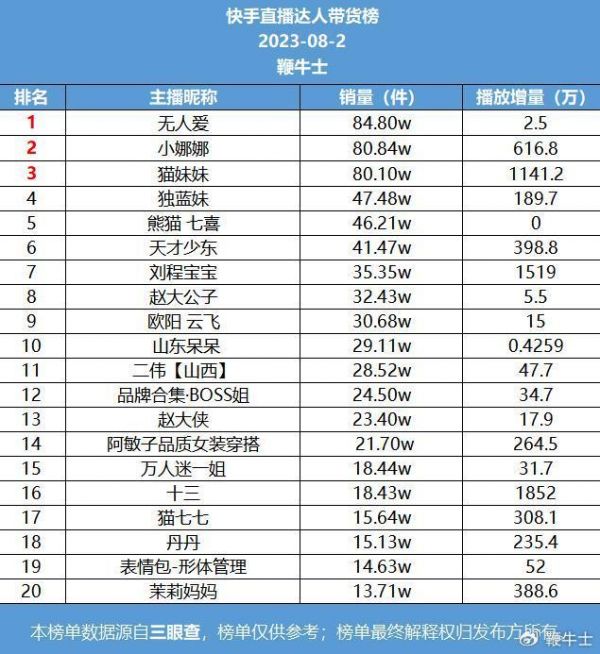 快手榜一无人爱,销量84.8万件;榜二小娜娜,销量80.84万件;榜三猫妹妹,销量80.1万件。