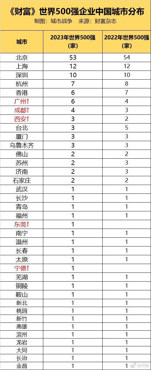 首先恭喜广州、成都、西安、东莞、宁德等城市新增了世界500强企业。