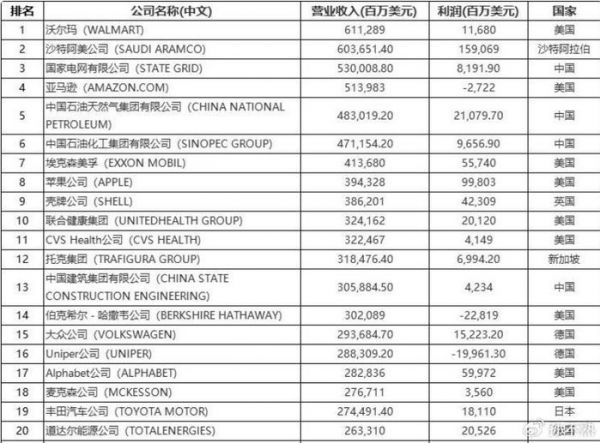 沃尔玛(营收6112.89亿美元)、沙特阿美公司(营收6036.51亿美元)、国家电网有限公司(营收5300亿美元营收)、亚马逊(营收5139亿美元营收)、中国石油天然气集团有限公司(营收4830.19亿美元)、中国石油化工集团有限公司(营收4711.54亿美元)、埃克森美孚(营收4136.8亿美元)、苹果公司(营收3943.28亿美元)、壳牌公司(营收3862亿美元)、联合健康集团(营收3241亿美元)。