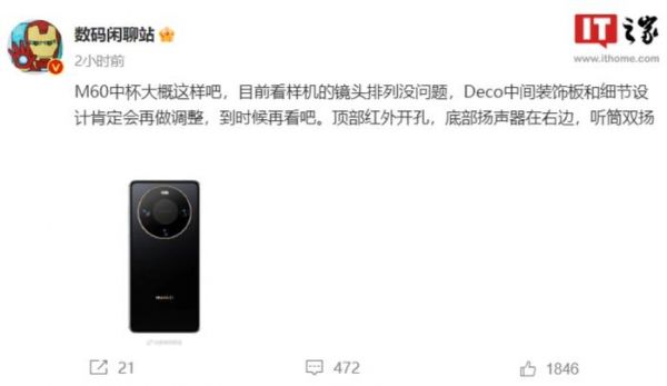华为Mate 60外观被曝 10月发布 后置四摄