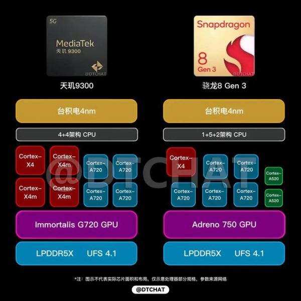 (图源@DTCHAT)如果仅看纸面参数,天玑9300比骁龙8 Gen 3多了3颗超大核,峰值性能上限会更夸张,极限性能理论上会更有优势。但我们都知道,在手机芯片上,超大核心很难持续以峰值性能输出,日常使用骁龙新品未必会落下风。骁龙8 Gen 3的方案更保守,但也更稳;天玑9300狠命堆料,力图以极限性能来取胜。
