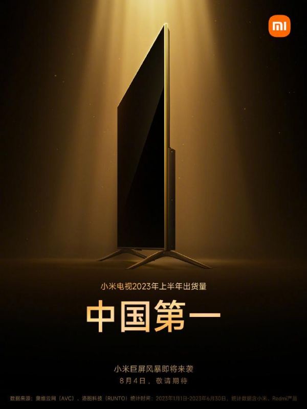 IT之家 8 月 3 日消息,据小米电视官方消息,2023 年小米电视上半年出货量中国第一。此外,小米宣布小米巨屏风暴即将来临,明日公布新品。