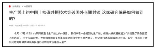 最近有个消息,挺令人振奋的:根据央视系列报道《生产线上的中国》,中国的核磁共振(MRI)技术成功突破了外国多年来的封锁,国产核磁共振设备实现了自主研发并成功量产——这有望大幅度降低核磁共振设备的采购费用和使用成本。