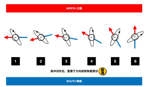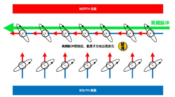 此时,如果对人体射出一束有特定频率的射频脉冲,那么和这个脉冲同频的氢原子就会开始共振。而一旦开始共振,它的振动和方向就会和周围其他的氢原子的表现产生差异。