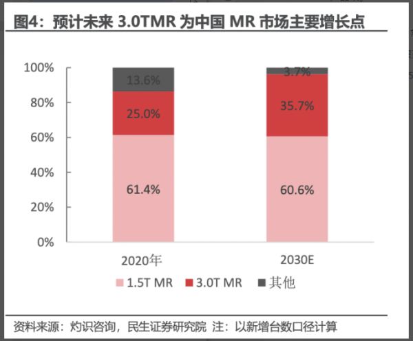 根据德邦证券研究院的分析,在2030年之前,国内MRI设备的格局将会发生较大变化。1.5T的比重将下降至60%以下,3.0T则会快速上涨到40%的比重,3.0T以上设备的比重也有望超过5%。