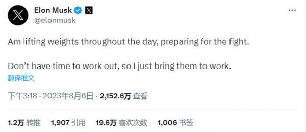 8 月 6 日,马斯克在 X 上发文说:“自己每天都在练习举重,为了格斗做准备。因为没有时间锻炼,所以我就带他们去上班。”