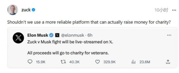 马斯克还表示:“扎克伯格和我的格斗比赛将在 X 上直播,所有收益将捐给退伍军人慈善机构。”
