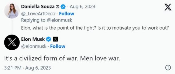 当一位 X 用户借机问起「格斗的意义以及是否出于激励自己健身的目的」时,马斯克回复称:“这是一场文明形式的战斗。男人热爱战斗。”