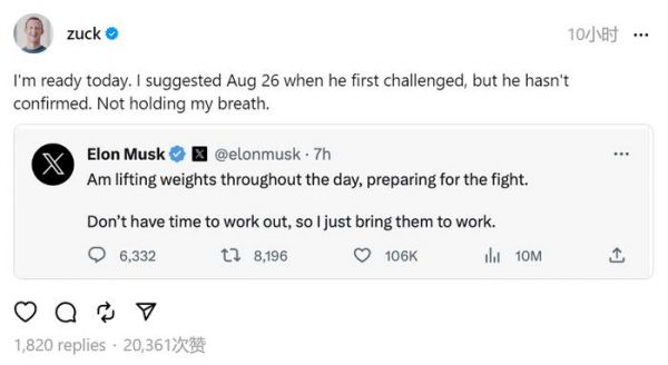 “钢铁侠”大战“机器人”!马斯克称「笼中格斗」将在 X 上直播,小扎应战:8 月 26 日如何?