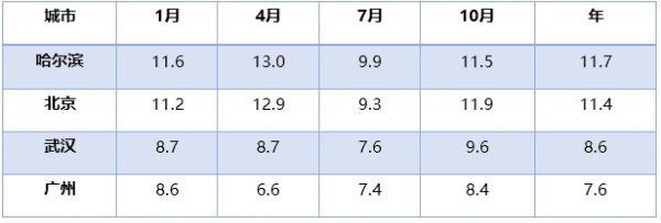 更能说明问题的是表1中1月~4月的气候变暖特性。北半球从冬入春的1月-4月是一年一度气候变暖的前半程,从表中数据看,在1月~4月的气候变暖过程中,地处南部的广州和地处北方的哈尔滨和北京,以及地处中部的武汉,有着完全不同的变暖特性,却有明显的规律可循。4月份,地处南部的广州处于梅雨季节,而位于北方的哈尔滨和北京则处于“天干物燥”的风季。这时广州的日较差最小,哈尔滨和北京的日较差则最大。
