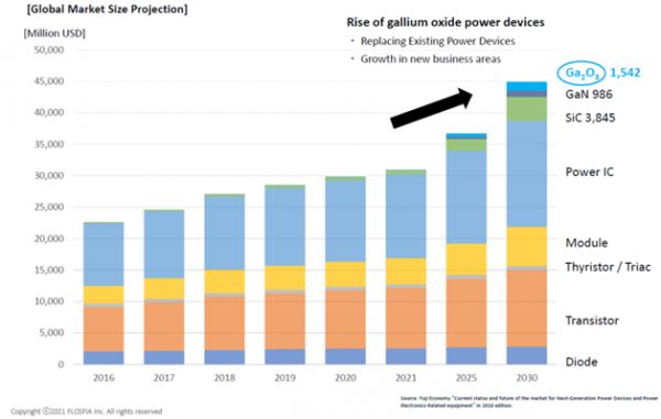 全球功率器件市场和氧化镓功率器件市场规模(百万美元),来源:FLOSFIA