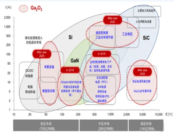 长期来看,氧化镓的功率器件预计将在650V/1200V/1700V/3300V的市场中发挥作用,并预计在2025年至2030年将全面渗透车载和电气设备领域。短期来说,氧化镓的功率器件将首先在消费电子、家电以及高可靠、高性能的工业电源等领域出现。它的这些特性可能使其在硅(Si)、碳化硅(SiC)、氮化镓(GaN)等材料之间形成竞争。
