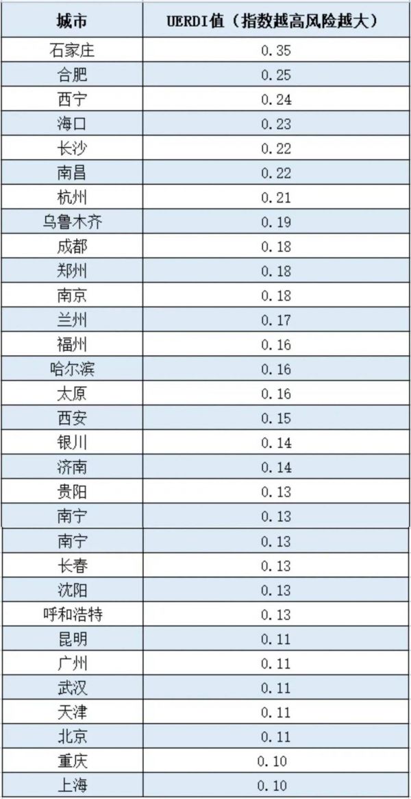 一般来说,地震风险度指数(UERDI)大于0.25,具有较大的风险,需要格外注意对地震的防范。这意味着石家庄、合肥、西宁的地震灾害危险度相对最高,而上海和重庆的地震灾害危险度相对较低。