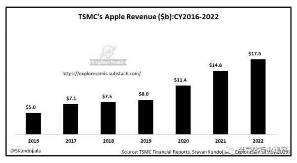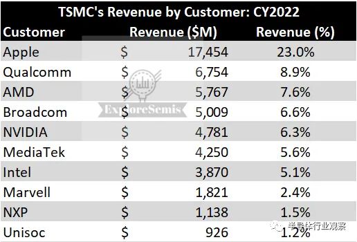 据财报显示,全球最大的半导体代工厂台积电 2022 年服务了 532 家客户。不过,其前 10 名客户占其营收的 68%。其中,苹果是最大客户,占台积电营收的 23%。报道指出,台积电的苹果收入在 2022 年增长了 18.2% 至 175 亿美元。