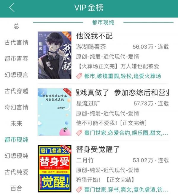 耽美与言情各占据晋江的半壁江山,其文风变化与言情作品如出一辙,比如当下纯爱类VIP金榜上的《他说我不配》《和豪门逆子上娃综后爆火了》《假少爷觉醒后全员火葬场》等,和收藏榜单中的言情文一样,采用的都是日式轻小说中频繁出现的书名格式。
