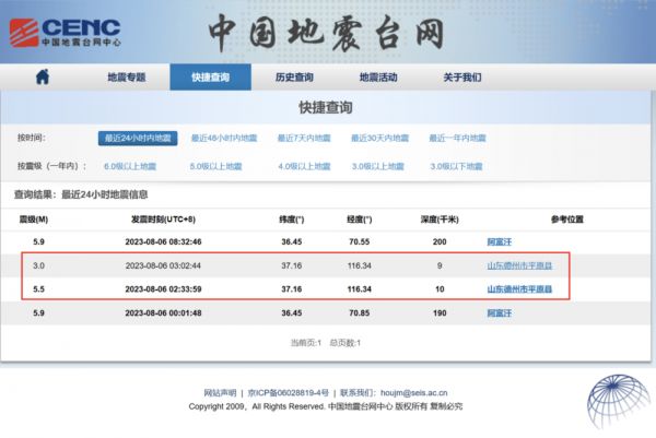 昨天一早,突然被朋友圈的父老乡亲吓到,我风调雨顺的山东竟然地震了。据中国地震台网正式测定,8月6日2时33分在山东德州市平原县发生5.5级地震,震源深度10公里,震中位于北纬37.16度,东经116.34度。8月6日3时2分在山东德州市平原县发生3.0级地震,震源深度9公里,震中位于北纬37.16度,东经116.34度。