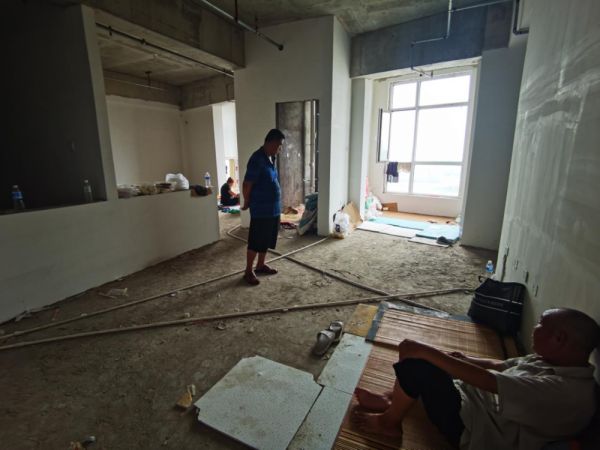 邦创基地是高层公寓楼,主体已经完工,内部工程还在完善中,没有步梯扶手,部分楼层没有装修,里面堆放着各种各样的垃圾,有些是安置点村民扔掉的,有些是遗留的建筑垃圾。