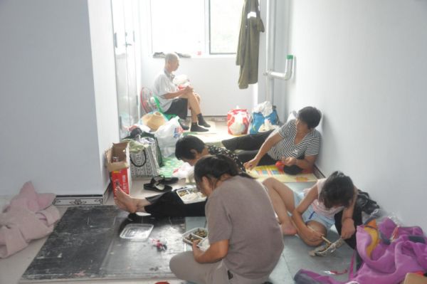 相比而言,邦创基地安置点没有水电,没有卫生间,很多村民都居住在没有装修的毛坯房内,有的村民带了凉席,没有凉席被褥的,就简单用纸箱或泡沫片铺在地上。