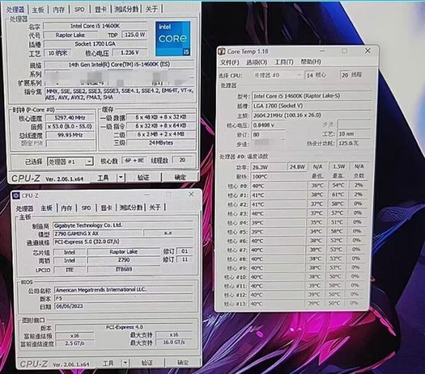 这颗 Raptor Lake-S Refresh 处理器运行在 Z790 平台(F5 BIOS 的技嘉 Z790 Gaming X AX)上,拥有 14 核 20 线程以及 5.3 GHz 的加速频率,兼容 600/700 系列主板。