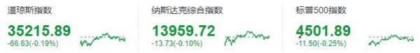 道琼斯指数收于35215.89点,下跌66.63点,跌幅0.19%;标准普尔500指数收于4501.89点,跌幅0.25%;纳斯达克指数收于13959.72点,跌幅0.10%。