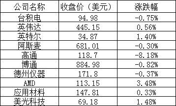 芯片龙头股多数下跌,高通跌幅超过8%;英伟达、英特尔、AMD等上涨,AMD涨幅超过3%。