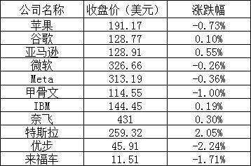大型科技股涨跌不一,谷歌、亚马逊和奈飞上涨,涨幅均不超过1%;苹果、微软和Meta下跌,跌幅均不到1%。