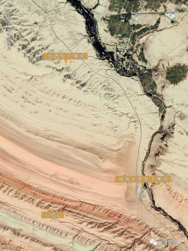 伯西哈千佛洞和柏孜克里克千佛洞都位于吐鲁番市区东部的火焰山北麓,相距只有2公里,前者却几乎无人问津(图:Google map)▼