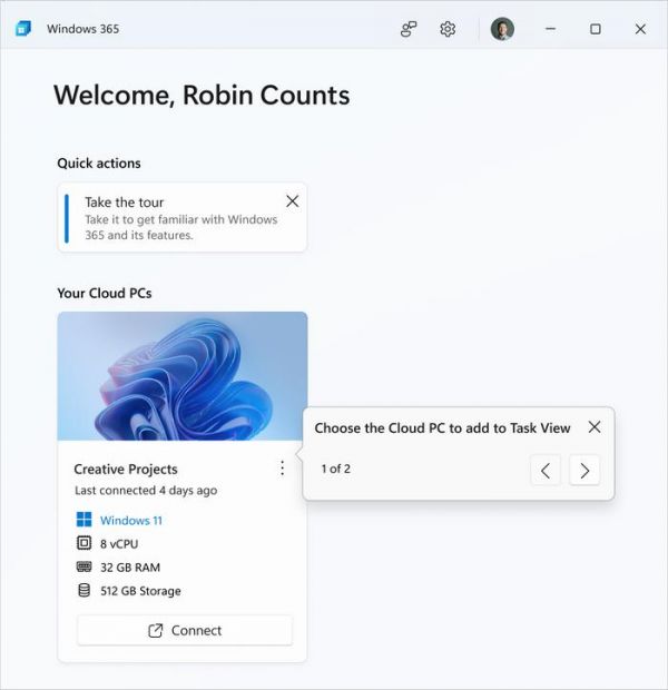 在运行简单的首次运行向导后,本地 PC 上的任务视图将通知您现在可以使用它切换到云 PC。您也可以使用 Cloud PC 上的任务视图从 Cloud PC 切换本地 PC。