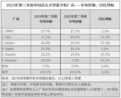 IDC数据显示,二季度在中国市场,除了华为增长一枝独秀,OPPO略稳,小米、荣耀以及vivo出货量同比继续以超过两位数的速度下滑。