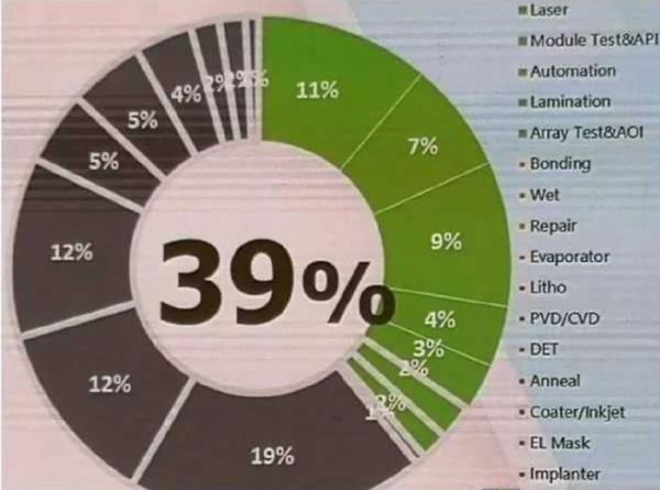 从CINNO research统计的数据来看,国内设备供应商在OLED制程中的覆盖比率整体只有39%,各制程中占比非常低。