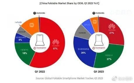 Counterpoint的研报显示,今年一季度,在中国折叠屏市场,华为、OPPO、三星的出货份额旗鼓相当,看上去是一个非常稳定的三足鼎立格局。