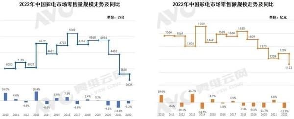 在这样的主旋律下,彩电市场也没有找寻到合适的增长通路。奥维云网(AVC)的数据显示,2022年中国彩电市场零售量规模为3634万台,同比下降5.2%,零售额规模为1123亿元,同比下降12.9%。