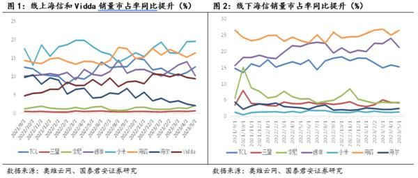 根据奥维云网数据,2022年海信线上销量同比增长了34%,其中Vidda品牌销量同比增长94%,占到了海信系总线上销量的35%;而根据公司的公告,Vidda品牌2022年的销量同比增速高达99%。