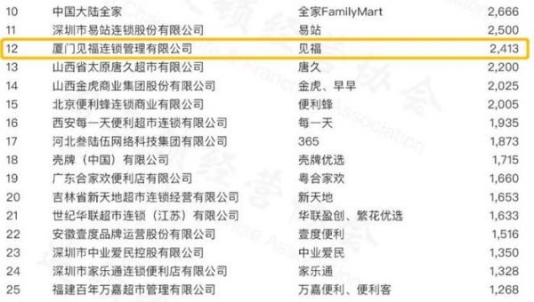 福建便利店排名第1(全国第12名):厦门见福连锁管理,主打的便利店品牌是见福,门店数量为2413家。总部位于福建厦门海沧区,业务包含商业贸易、生产制造、仓储物流以及信息智能等。品牌名“见福”含有看见幸福、遇到幸福、见证幸福等字意,里面包含着吉祥和祝福,其便利店主要分布在福建、江西和四川三省。近些年已从“批发型零售企业”向“制造型零售企业”转型,将重心放在了鲜食工厂和供应链的建设上。