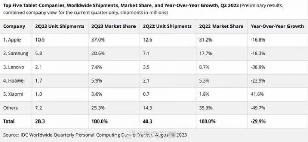 近日,IDC公布了2023年第2季度全球平板出货量数据,第2季度全球总计出货平板2830万台,同比下降29.9%。该季度出货前5品牌仅有小米平板出货量逆势增长,同比增长41.6%。