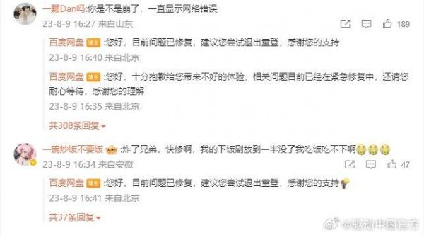 8月9日消息。今日下午四点左右,多位网友反馈称百度网盘崩了,移动端及网页端都无法正常打开文件页面。例如百度网盘在使用过程中出现视频播放失败情况,其他业务也有用户反映“打不开”“崩了”的现象,不过百度网盘官方刚刚已经在官微表示已经修复,可以正常使用了。 建议您尝试退出重登,感谢您的支持。