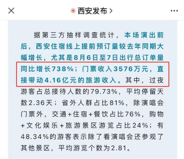 据西安发布8月7日消息,据第三方抽样调查统计,本场演出前后,西安住宿线上提前预订量较去年同期大幅增长,尤其是8月6日至7日出行总订单量同比增长738%;门票收入3576万元,直接带动4.16亿元的旅游收入。